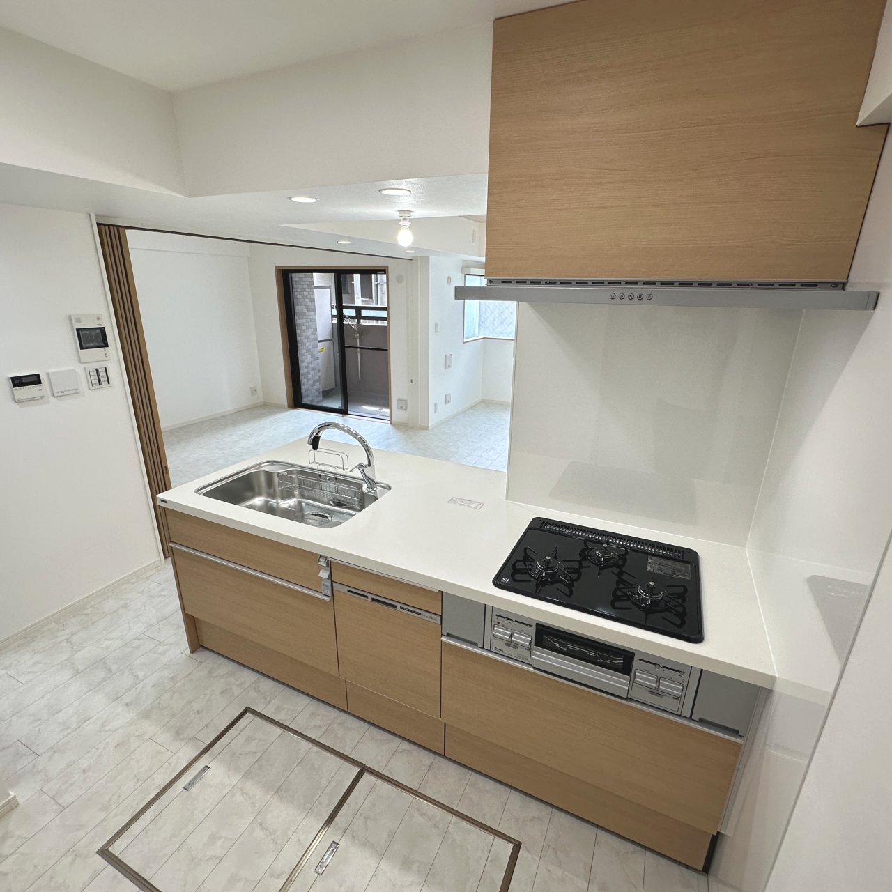 インターフォンを廊下へ移設したことで、もともと袖壁に埋め込まれていた部分がすっきりと片付きました。袖壁がなくなった分、キッチンとリビングがより開放的につながり、実際の広さ以上に空間が広く感じられます。