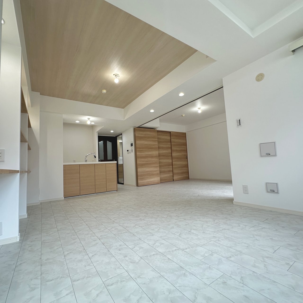 壁紙(クロス)張替え:リビング・居室すべてのクロスを新調。天井もおしゃれなクロスに貼り替え、ぐっと洗練された空間に。