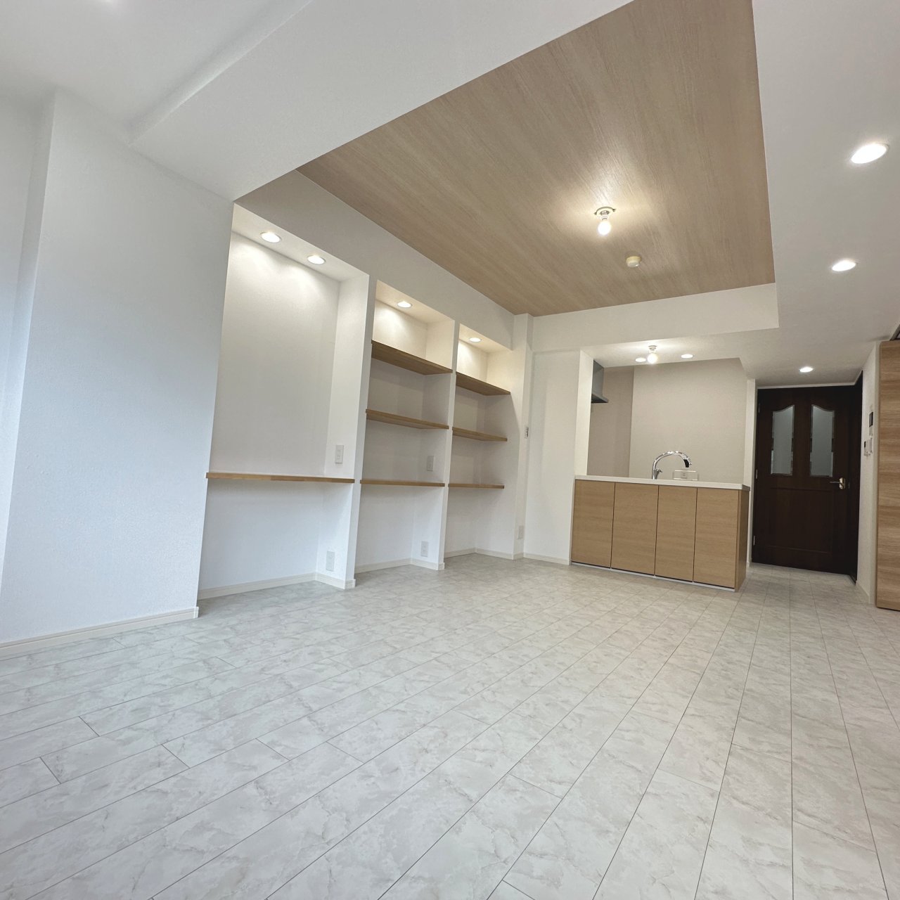 照明計画:暗く感じられていたお部屋にダウンライトを新設。空間全体が明るくスタイリッシュに生まれ変わりました。
