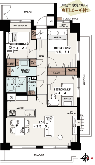 ■ 専有面積:64.57㎡ ■ バルコニー面積:14.90㎡